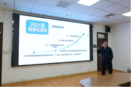 首先,张成处长从2021年度信息化建设经费情况,2021年信息化项目情况,需求部门项目情况,网络安全工作安排四个方面对2021年网络安全与信息化工作进行了汇报,对学校2021年度信息化建设项目及年度总任务进行了详细地安排部署,与会人员就新年度任务落实进行了充分地讨论交流。