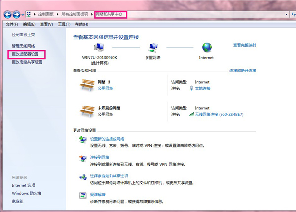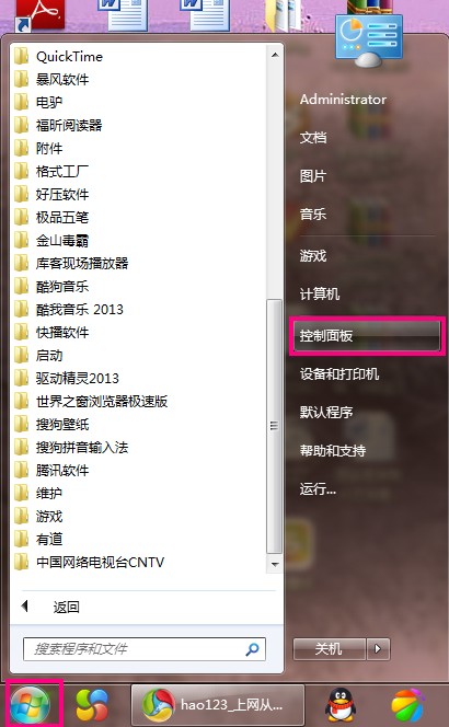 1、点击开始 选择控制面板,双击图标网络和共享中心。